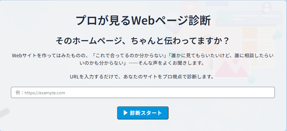 URLを入力するだけで、あなたのサイトをプロ視点で診断します。